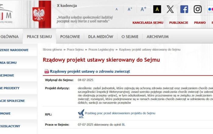 Informujemy o ukazaniu się na stronach Sejmu RP informacji odnośnie wpływu w dniu 4 lipca 2025r. rządowego projektu ustawy o zdrowiu zwierząt, która, jako transponująca ...