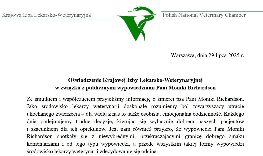 Działając w ramach obrony godności zawodowej zamieszczamy poniżej Oświadczenie Krajowej Izby Lekarsko-Weterynaryjnej w związku z publicznymi wypowiedziami Pani Moniki Richardson. Jako przedstawiciele zawodu zaufania publicznego stanowczo protestujemy przeciw formie i językowi, jakich Pani Monika Richardson używa w swoich publicznych wypowiedziach na temat lekarzy weterynarii, które wprost deprecjonują nasz zawód. Użyte określenia są krzywdzące, niesprawiedliwe i godzą w dobre imię lekarzy weterynarii, którzy wykonują jeden z najbardziej wymagających zawodów medycznych – nierzadko w warunkach ogromnego stresu i przy niedoborze systemowego wsparcia.