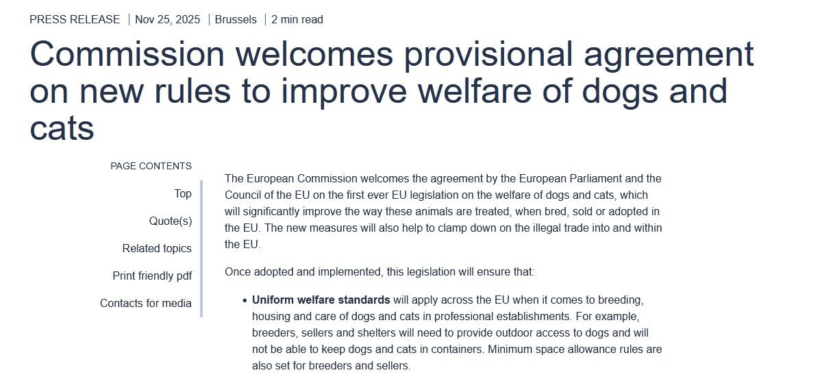 Z satysfakcją informujemy, iż Rada i Parlament Europejski osiągnęły wstępne porozumienie w sprawie dobrostanu i możliwości identyfikacji psów i kotów. Określa ono pierwsze w historii unijne normy minimalne. Porozumienie ma poprawić dobrostan psów i kotów u hodowców, w sklepach i schroniskach, a zarazem zwiększyć ochronę konsumentów, zapewnić uczciwą konkurencję i zwalczać nielegalny handel zwierzętami.