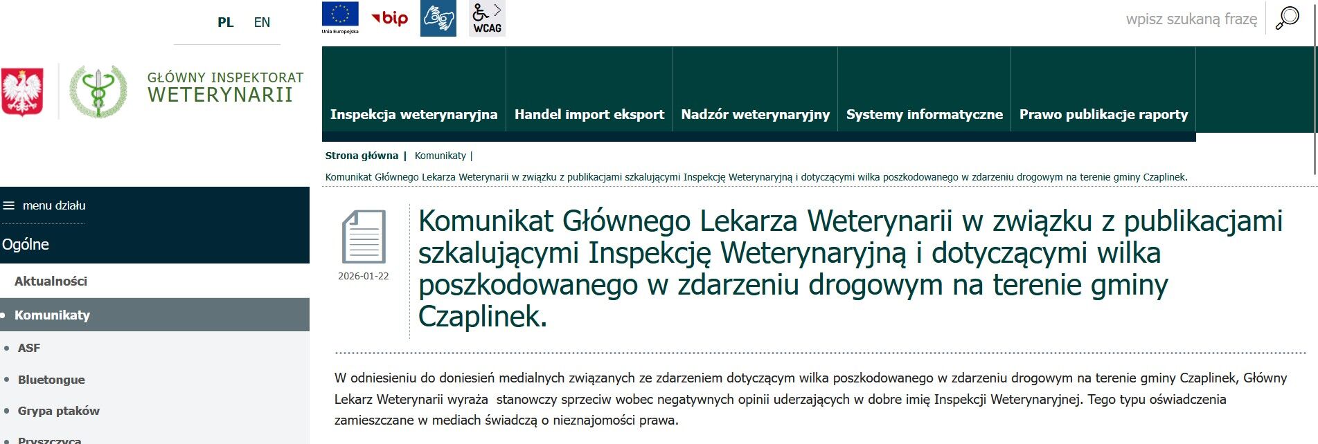 W odniesieniu do doniesień medialnych związanych ze zdarzeniem dotyczącym wilka poszkodowanego w zdarzeniu drogowym na terenie gminy Czaplinek, Główny Lekarz Weterynarii wyraża stanowczy sprzeciw wobec negatywnych opinii uderzających w dobre imię Inspekcji Weterynaryjnej. Tego typu oświadczenia zamieszczane w mediach świadczą o nieznajomości prawa.