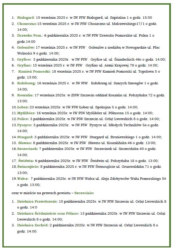 Ustalono następujące terminy i miejsca rejonowych zebrań wyborczych w celu przeprowadzenia wyborów delegatów na okręgowy zjazd lekarzy weterynarii Zachodniopomorskiej Izby Lekarsko-Weterynaryjnej w Szczecinie: